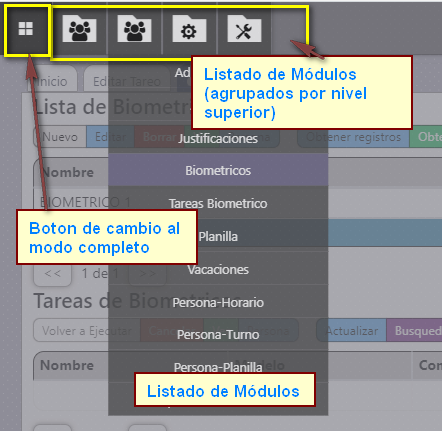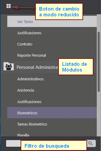 Aca se muestran los enlaces a los diferentes modulos del sistema, el acceso a cada modulo depende del nivel de acceso que tenga el usuario.