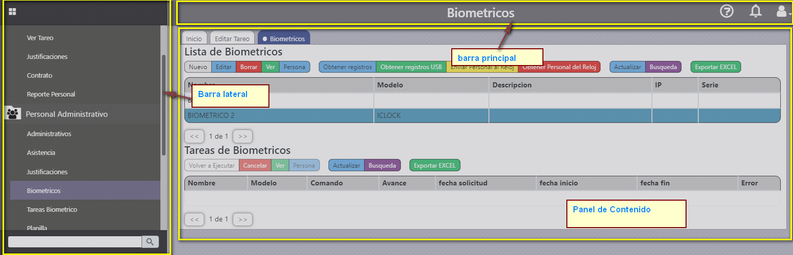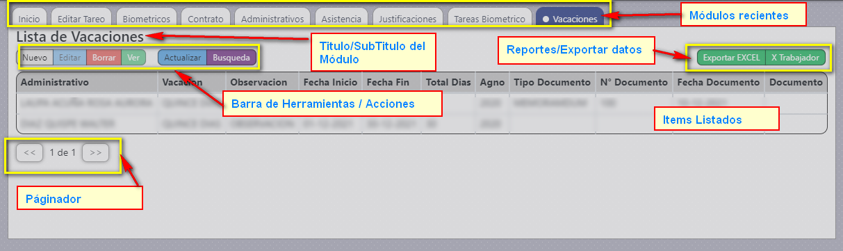 Aca Mostramos la información principal del modulo, en general la interfaz es similar en los diferentes módulos, y tiene las siguientes partes: