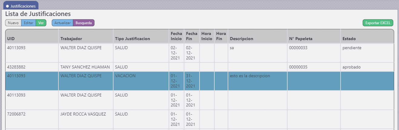 - Al hacer click en este botón se vuelve a listar las justificaciones del personal administrativo con los ultimos cambios realizados.