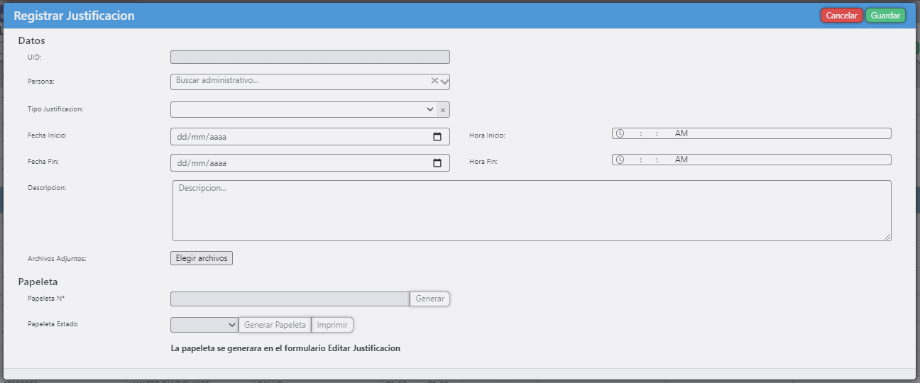 - El botón "Nuevo" abre un formulario donde registraremos los datos de la justificación del administrativo: