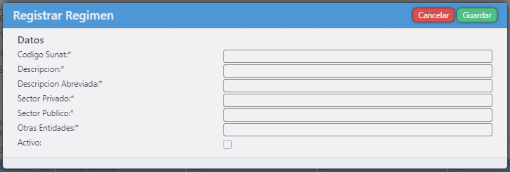 - El botón "Nuevo" abre un formulario donde registraremos los datos del regimen: