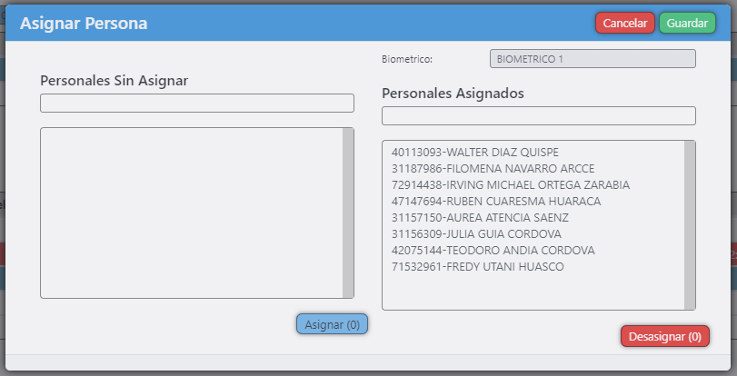 - El botón persona se activará al seleccionar un item del listado de biometricos. Este boton permite asignar y desasignar personal del un biometrico. Al hacer click en este botón nos abrirá un formulario con los datos del biometrico, seguidamente apareceran dos listado el primero pertenece a los personal no asignado y el segundo con personal asignado a este biometrico, podemos asignar o desasignar según nuestras necesidades finalmete procedemos a guardar los cambios.