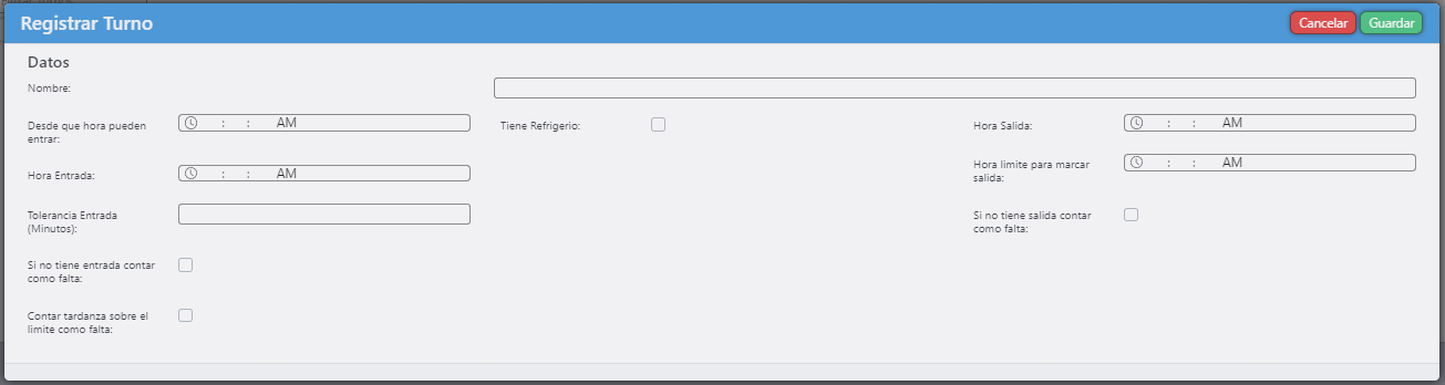 El módulo "Turno" es el encargado de gestionar el mantenimiento de los turnos que serán utilizadas en los otros módulos(Campos de selección como por ejemplo al registrar un contrato tambien se debe especificar el turno). En la parte central se muestra el listado de los turnos,
