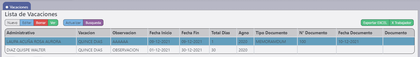 - Nos permite exportar los datos de la vacaciones de los administrativos en un archivo excel.