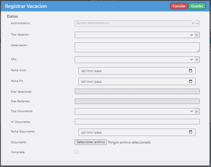 - El botón ver se activa al seleccionar un personal de listado vacaciones de administrativos. Al hacer en este botón nos abrirá un formulario con los datos del administrativo de solo lectura.